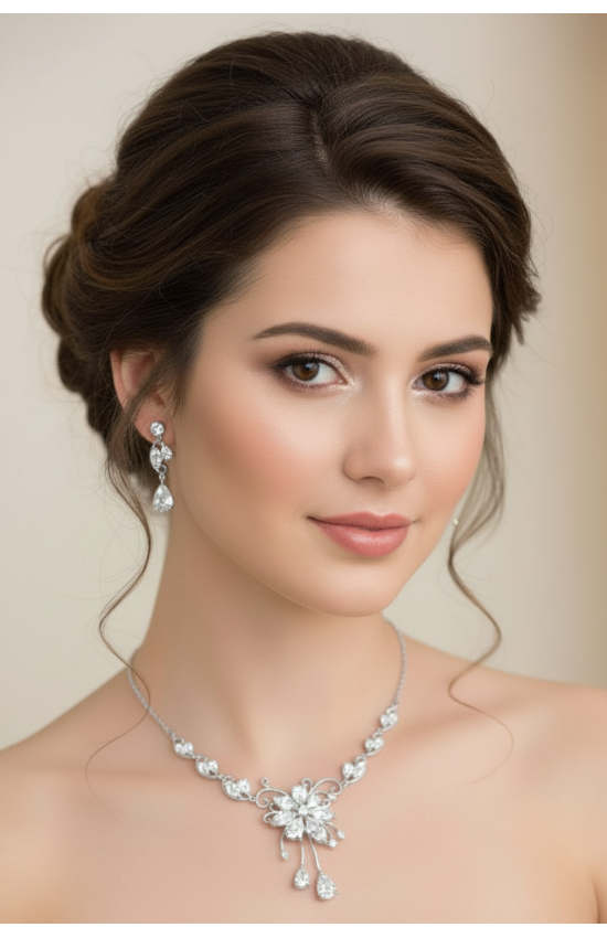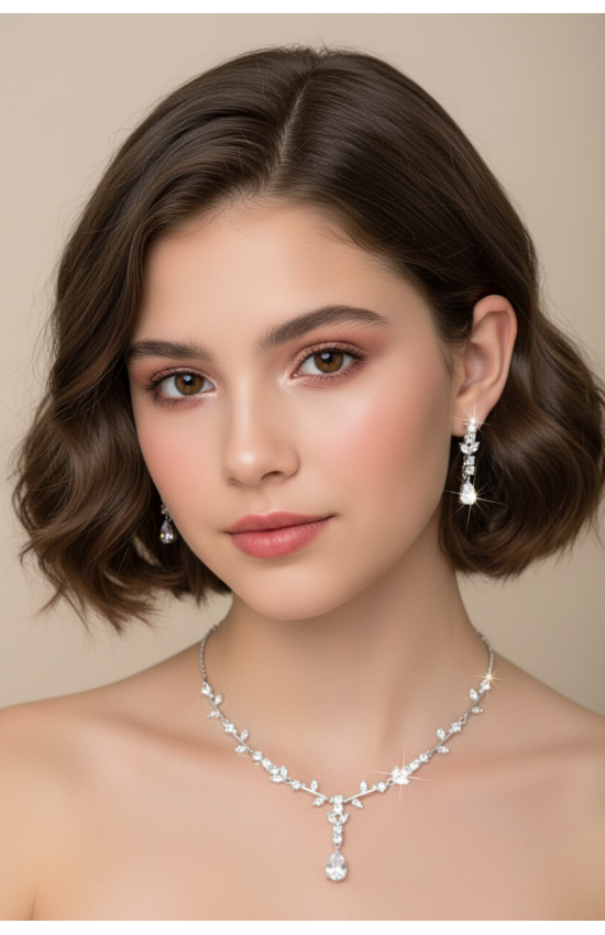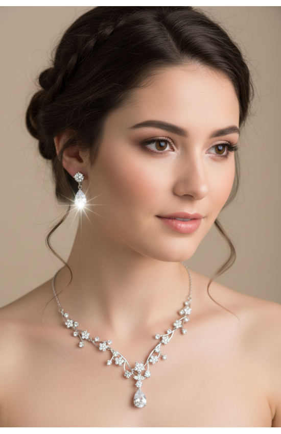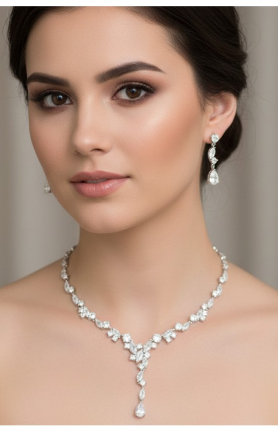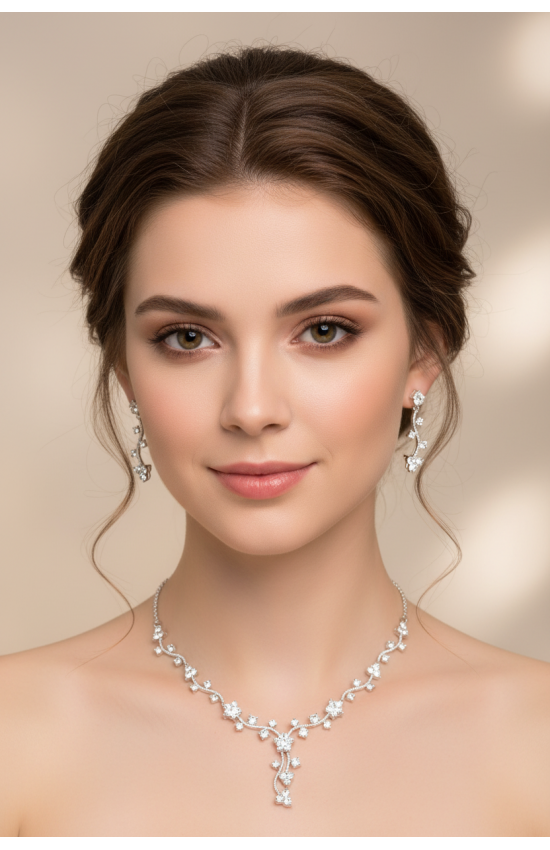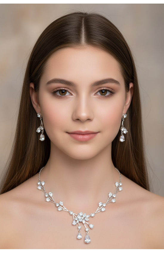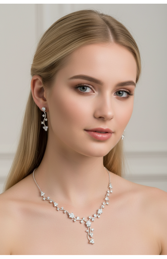 Комплект бижутерии из колье и сережек. Цвет: серебро с белыми прозрачными кристаллами. Серьги - застежка "гвоздик". Колье имеет удлиняющую цепочку.