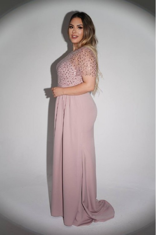 Легкое нарядное платье для девушек с пышными формами. Линия талии завышена. Есть разрез вдоль ножки...