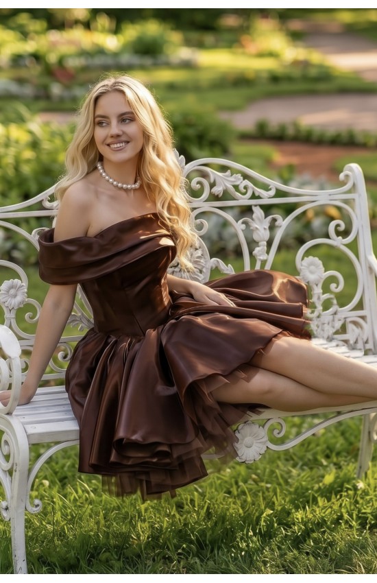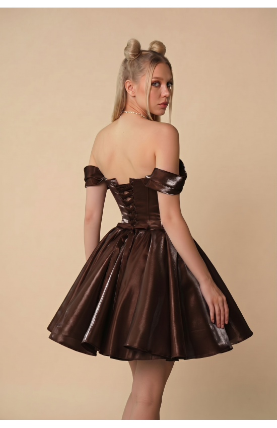 Короткое платье 0-150/2 шоколад из ткани органза "зеркало". Корсет регулируемый. Платье-трансформер. Лямки переходят в складку на корсете и отстегиваются полностью. Можно снять как одну лямку, получив при этом асимметрию, так и сразу две. Пышность юбке добавляет вшитая нижняя юбка из фатина. Есть подкладка, вшитые чашки для груди.