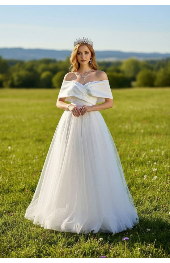Стильное свадебное платье на корсете. Нижний слой - атлас, средний слой - еврофатин с напылением блестящим глиттером, верхний слой - еврофатин. Красивое декольте обрамлено отворотами, которые прикрывают плечи и немного руки. Высокое качество и недорогая, доступная цена - преимущества этой модели.