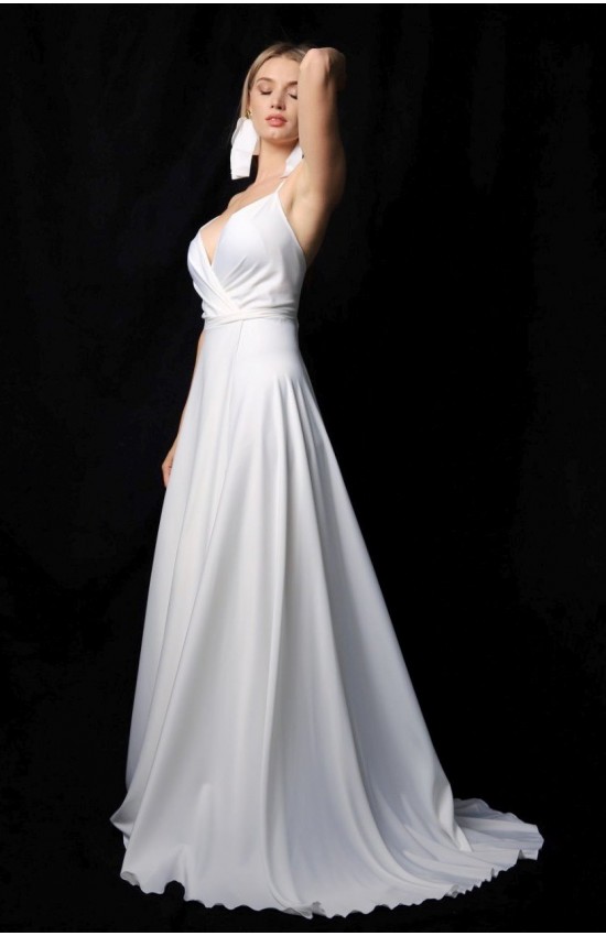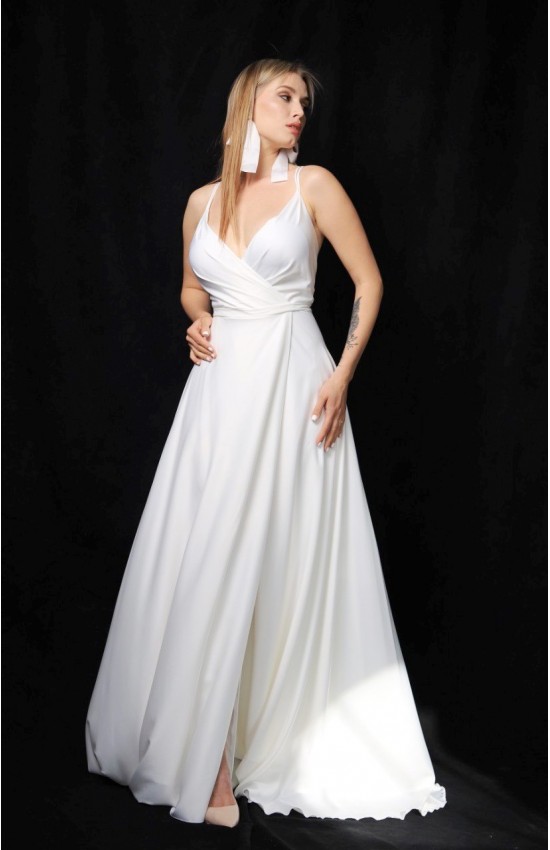 Стильное платье Адель артикул 0-43 в бело-молочном цвете актуально и современно. Нежный и струящийся японский шелк мягко ласкает тело. Расклешенная юбка в пол с запахом и разрезом по ножке - создают легкий образ. Невеста в таком платье может легко двигаться и танцевать. Платье заслуживает внимание как на выездную регистрацию брака, так и на роспись.