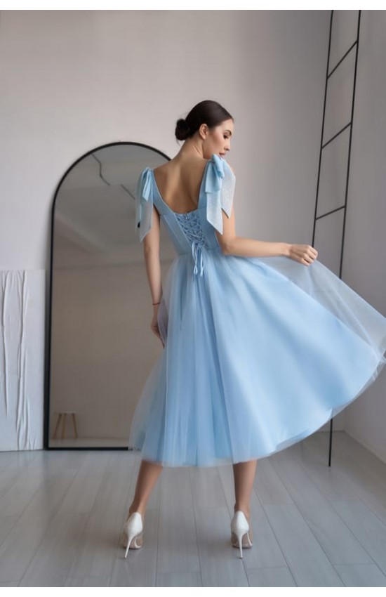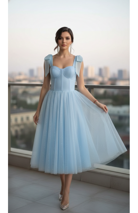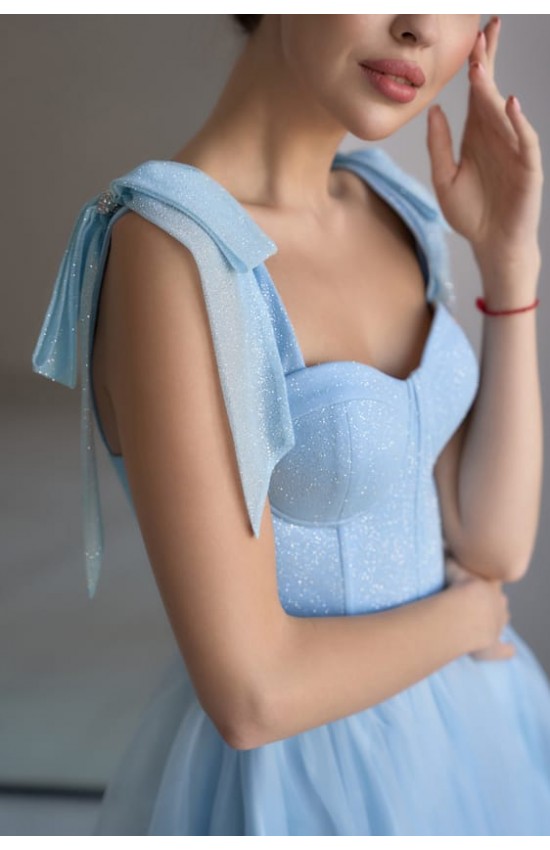 Платье из мерцающего глиттера с пышной юбочкой, длиной миди. Стильная модель с выделенными чашками для груди и бантами на плечах с декоративной пряжкой. Корсетное. Идеально на выпускной бал или для подружек невесты.