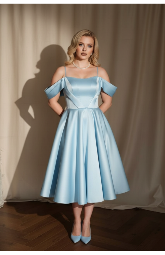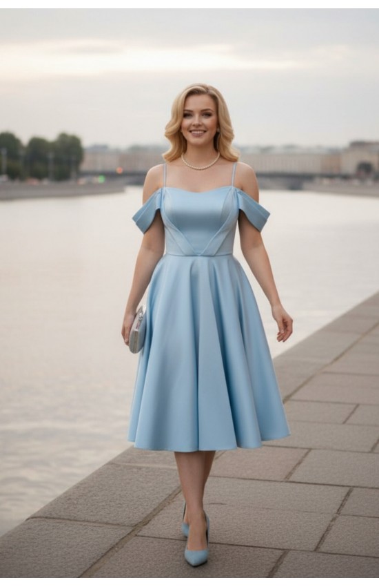 Платье голубого цвета на корсете с расклешенной юбкой. Корсет на косточках, на молнии и на завязках. По лифу корсета спереди - декоративные планки, которые сходятся на талии и создают эффект тонкой талии. Широкие лямки прикрывают плечи. Есть, регулируемые по росту, бретельки. Подклад с фатином для пышности юбки. Длина платья миди. Ткань: атлас микадо, хорошо держит форму, с легким и благородным блеском