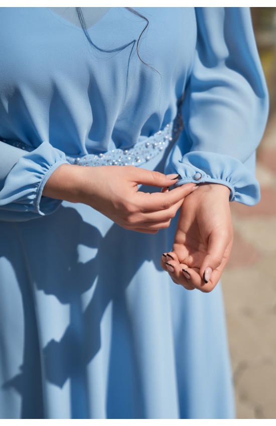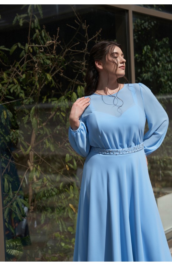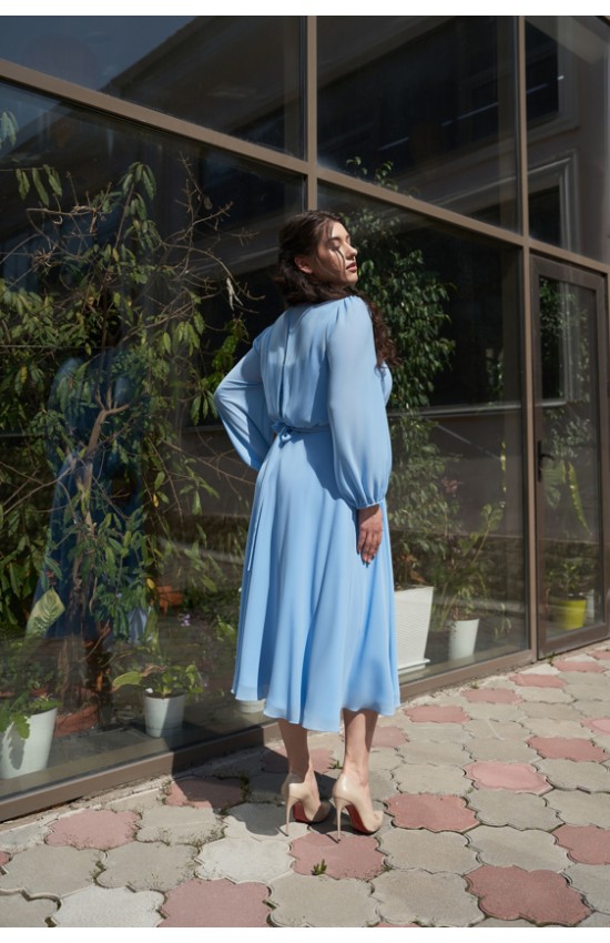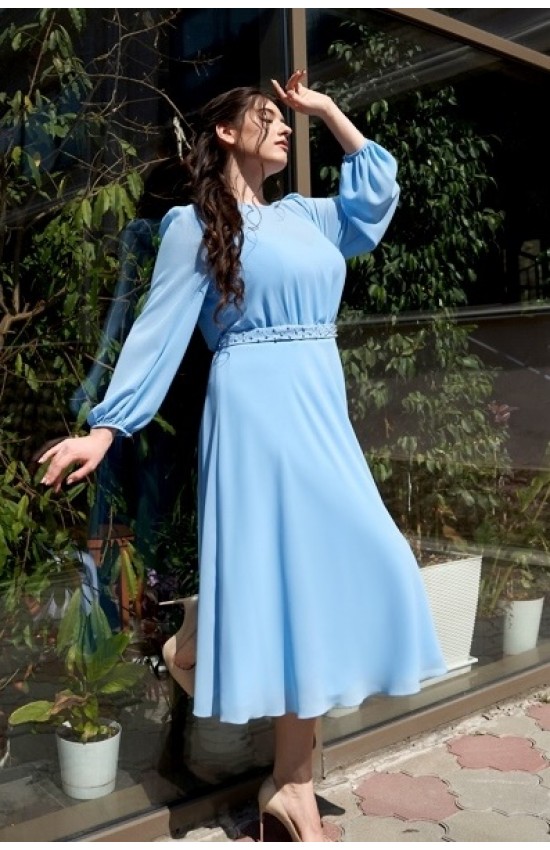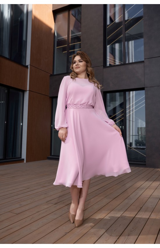 Шифоновое платье длиной миди с напуском, отрезное по линии талии с декоративным пояском ручной работы. Есть внутренний бюстгальтер по типу легкого корсета с чашками для груди.