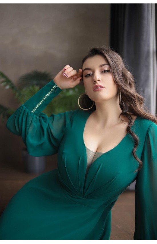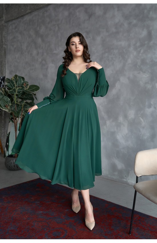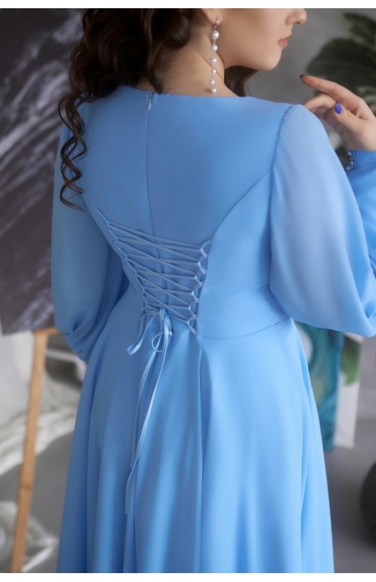 Платье из креп-шифона с длинными рукавами на высоких манжетах, которые украшены рядом страз и жемчужинами в цвет и застегиваются на молнию. Декольте с расколом и прикрыто сеточкой. Основа платья - атлас микадо. Отличная посадка на женскую фигуру, подчеркивает достоинства и прячет недостатки. Можно отрегулировать посадку завязками на спине.