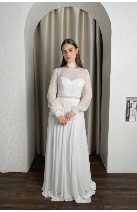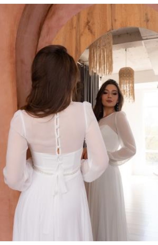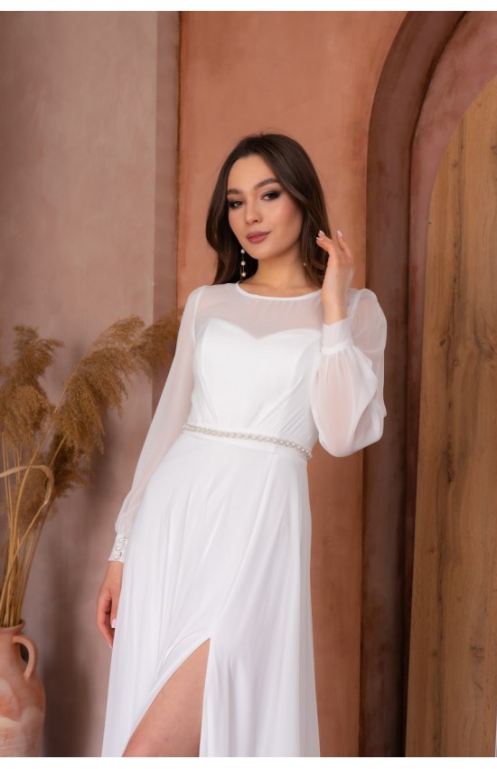 Платье-трансформер для невесты из многослойного еврошифона со съемным шифоновым болеро. Юбка - клеш. Платье - бюстье, можно носить без верха, застегивается на молнию сзади и завязывается по фигуре (легкий корсет с чашками). Низ болеро - поясок расшит вручную нежным жемчугом и тонким серебряным бисером. Комплект отлично подойдет нежной невесте как для регистрации брака, свадьбы, так и для венчания.