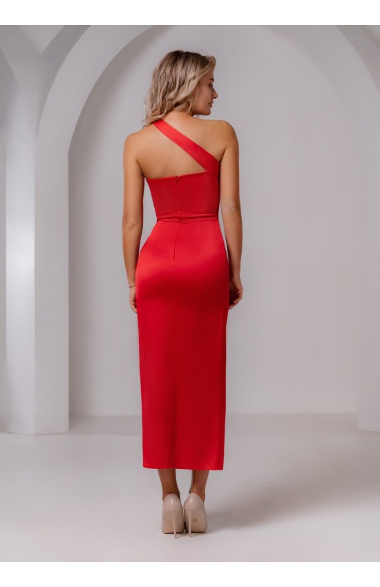 Вечернее платье миди из атласа магнус на одной широкой косой лямке, что является очень модной деталью