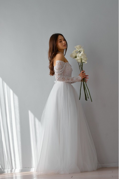 Очень красивое платье невесты из гипюра, еврофатина и мелкого глиттера "манка". Украшение - бусы, которые крепятся к платью. Есть вариант нюд (имитация прозрачного корсета), а есть корсет белое кружево на белом фоне.