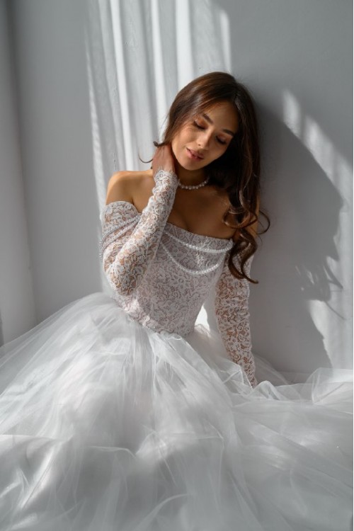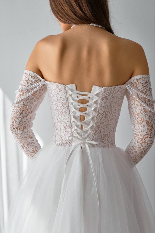 Сияющее платье-трансформер с модными перчатками для современной невесты, которая выбирает стиль..