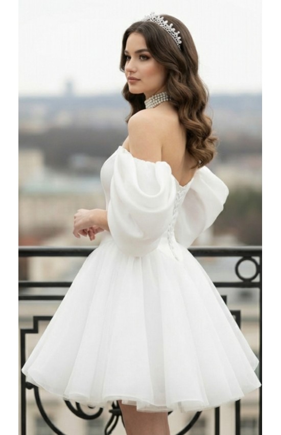 Роскошное платье-костюм (юбка + корсет) из восковой органзы и качественного глянцевого русского сати-атласа. Верх - стильный корсет с углом на косточках и с внутренними вшитыми чашками для груди, завязывается на спине. Съемные широкие ниспадающие рукава-крылышки. Юбка актуальной в этом сезоне длины - мини, пышная. Эта универсальная модель позволяет носить его раздельно: топ можно носить в дальнейшем с брючками, другими юбками, на блузу, под жакет. А юбку можно комбинировать с другим верхом, например с жакетом, топом или, даже с футболкой. В шкафу, 100%. не будет висеть после мероприятия. Вся информация в карточке этого товара.