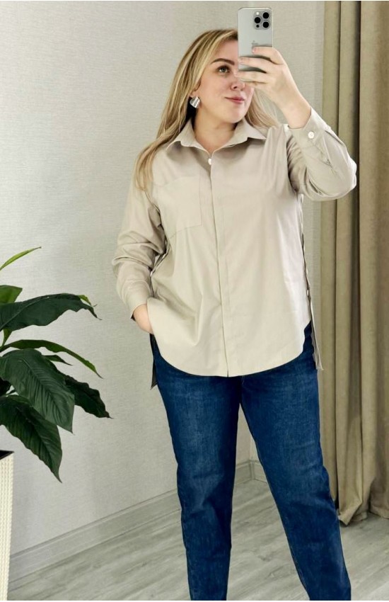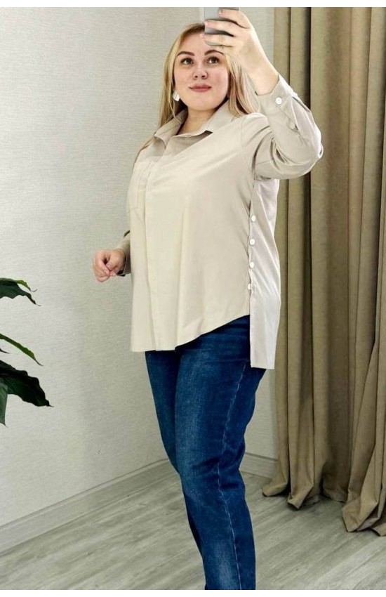Женская блуза с разрезами и застежкой по бокам. Спинка на кокетке со складочкой посередине.Ткань стрейч (немного тянется), что нравится полным женщинам, так как удобная в движении.