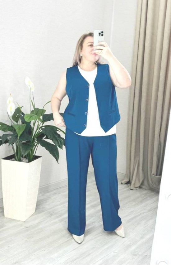 Элегантный брючный костюм светло-синего цвета с оттенком дыма. Жилет и брюки сделают на два размера стройнее свою обладательницу. Жилет на подкладке, полуприлегающий. Брючки прямые, на резинке, по бокам рабочие карманы. Рост модели на фото 168 см., размер 54.