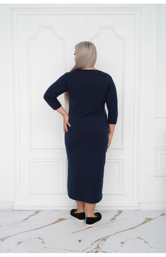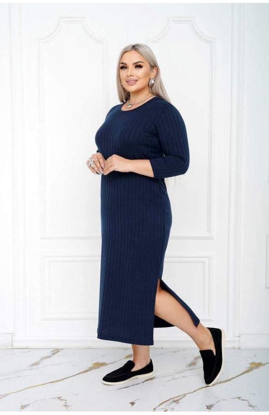 Трикотажное платье с разрезами по бокам, рукавами длиной 7/8. Трикотаж не толстый, с мелким продольным рисунком. Садится на фигуру не в обтяжку. Производится от 50 до 60 размера