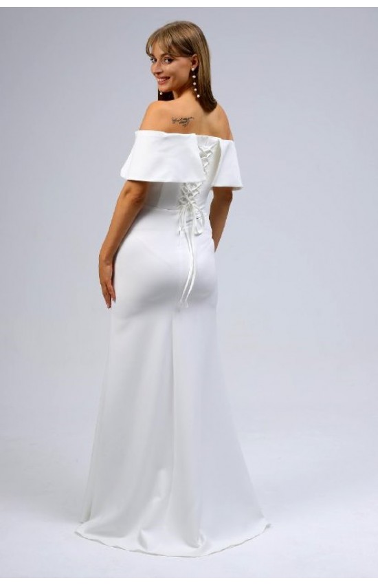 Платье для невесты силуэта "рыбка" или "русалка". Легкий корсет позволяет подтянуть платье по фигуре. Красивое декольте формируют чашки для груди и специальные вставки для удержания формы. Стильный отложной большой волан, переходящий в рукава. Ткань плательная "барби".