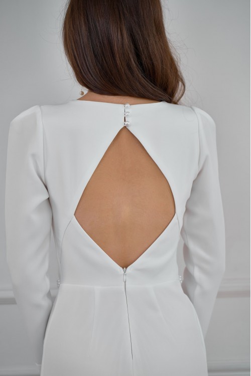Нежное платье ЛЕБЕДУШКА 0-36 белое шифон с открытой спинкой и жемчужными бусами, которые можно перек..