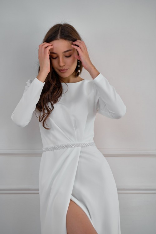 Платье-карандаш с запахом. Пышные длинные рукава с жемчужинами. Длина миди (за колено). Застежка - м..