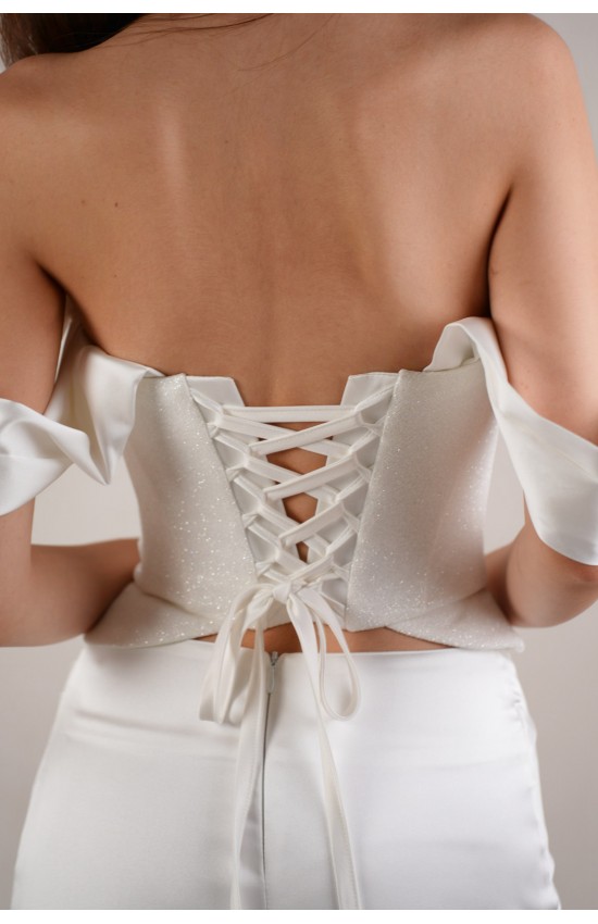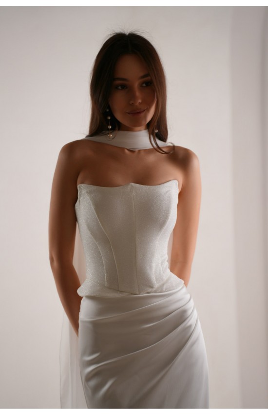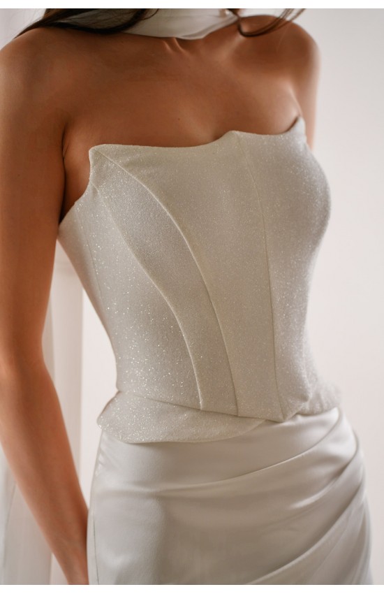 Платье силуэт русалка. Состоит из двух деталей: корсет и юбка с не длинным шлейфом. Ткань юбки: Кармина стрейч, ткань корсета: глиттер lux. Модель без разреза по юбке. Съемные крылышки-лямки.